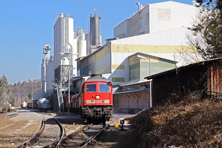 232 635-3 drückt einen Kalk-Leerzug zur Beladung bei der Fa. Merkle zurück.
